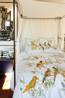Anthropologie. It consists of organic cotton on a fresh white background and a whimsy hand-painted look of stunning imagery with a bright yellow and green parrots, macaws and cockatoos. It's so cheerful and beautiful perfect backdrop for a comfy weekend in bed!!